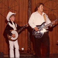 - Mike Campbell playing banjo as a kid, wearing a white cowboy hat.